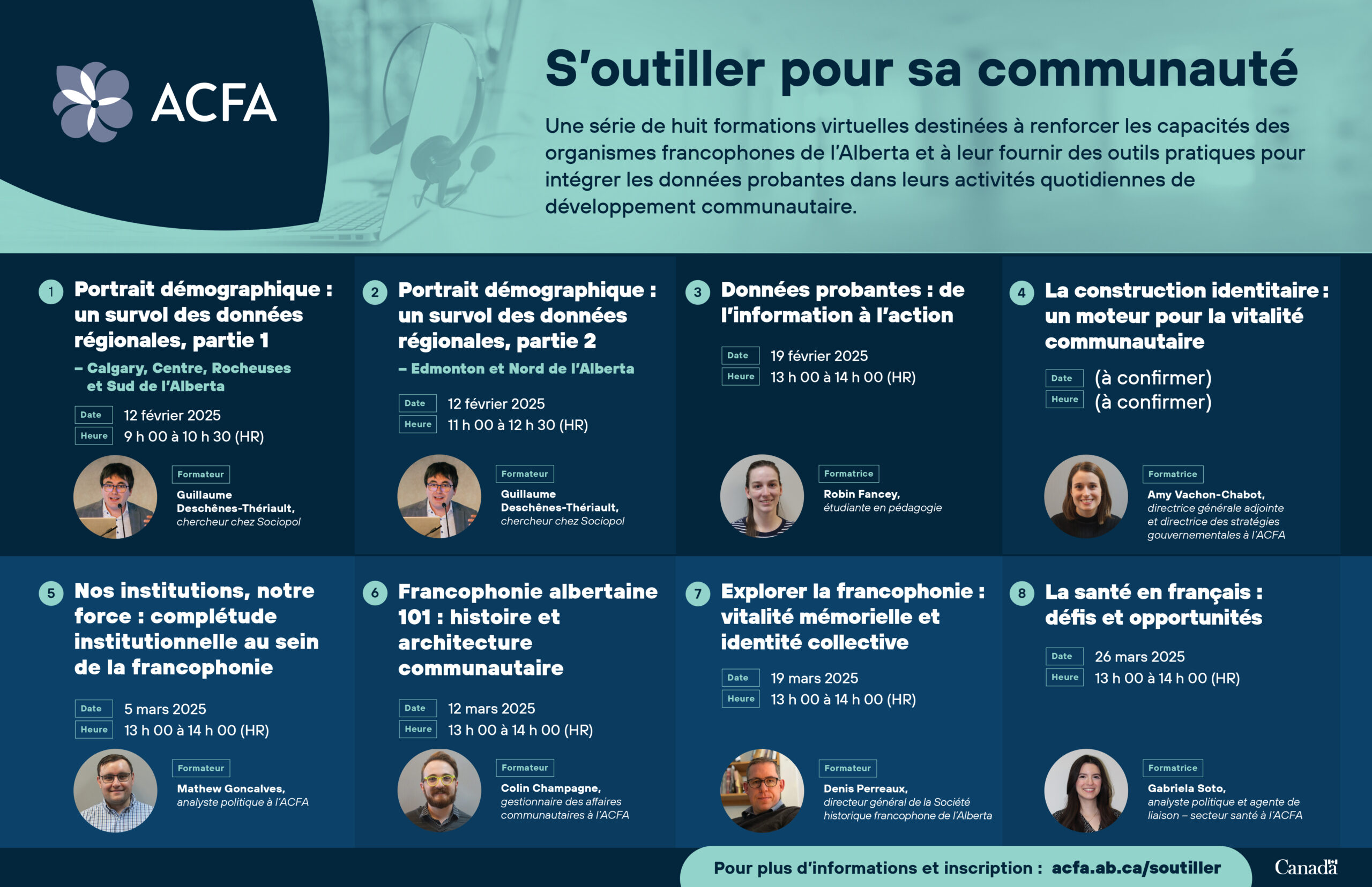 L’ACFA est ravie de vous inviter à participer à « S’outiller pour sa communauté », une série de huit formations virtuelles conçues pour renforcer les capacités des organismes communautaires francophones de l’Alberta.