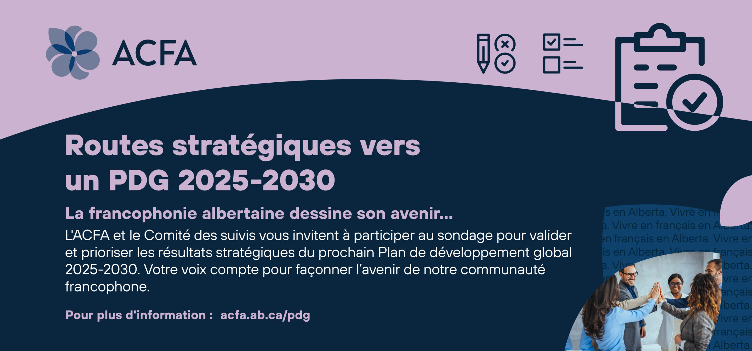 L’ACFA et le Comité des suivis invitent les Albertains et Albertaines d’expression française à prendre part au processus de validation du Plan de développement global (PDG) 2025-2030 de la francophonie albertaine en répondant au sondage « Routes stratégiques vers un PDG 2025-2030 ». Ce sondage est une étape essentielle dans l’élaboration d’un plan stratégique pour l’avenir de notre communauté, qui façonnera notre développement pour les cinq à dix prochaines années.