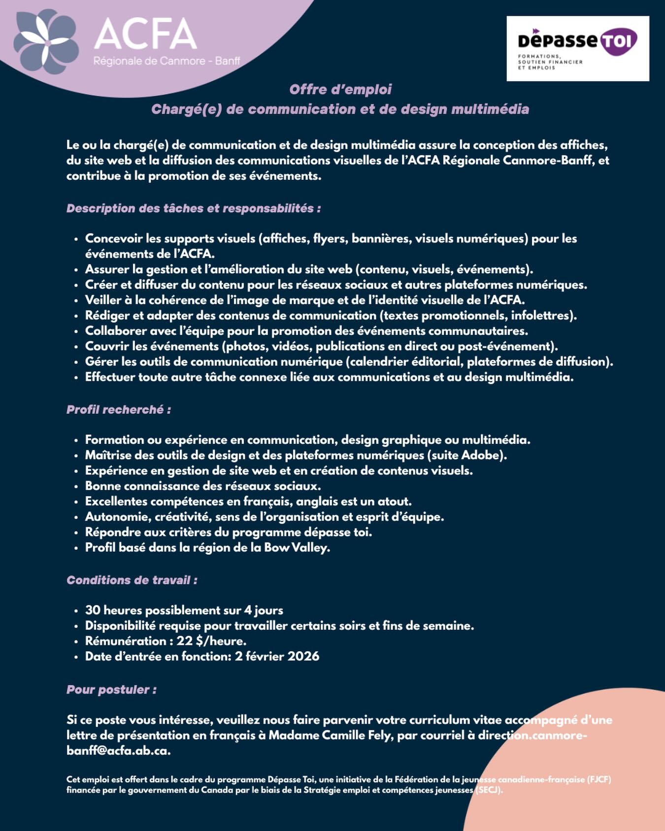 Le ou la chargé(e) de communication et de design multimédia assure la conception des affiches, du site web et la diffusion des communications visuelles de l’ACFA régionale Canmore-Banff, et contribue à la promotion de ses événements.
