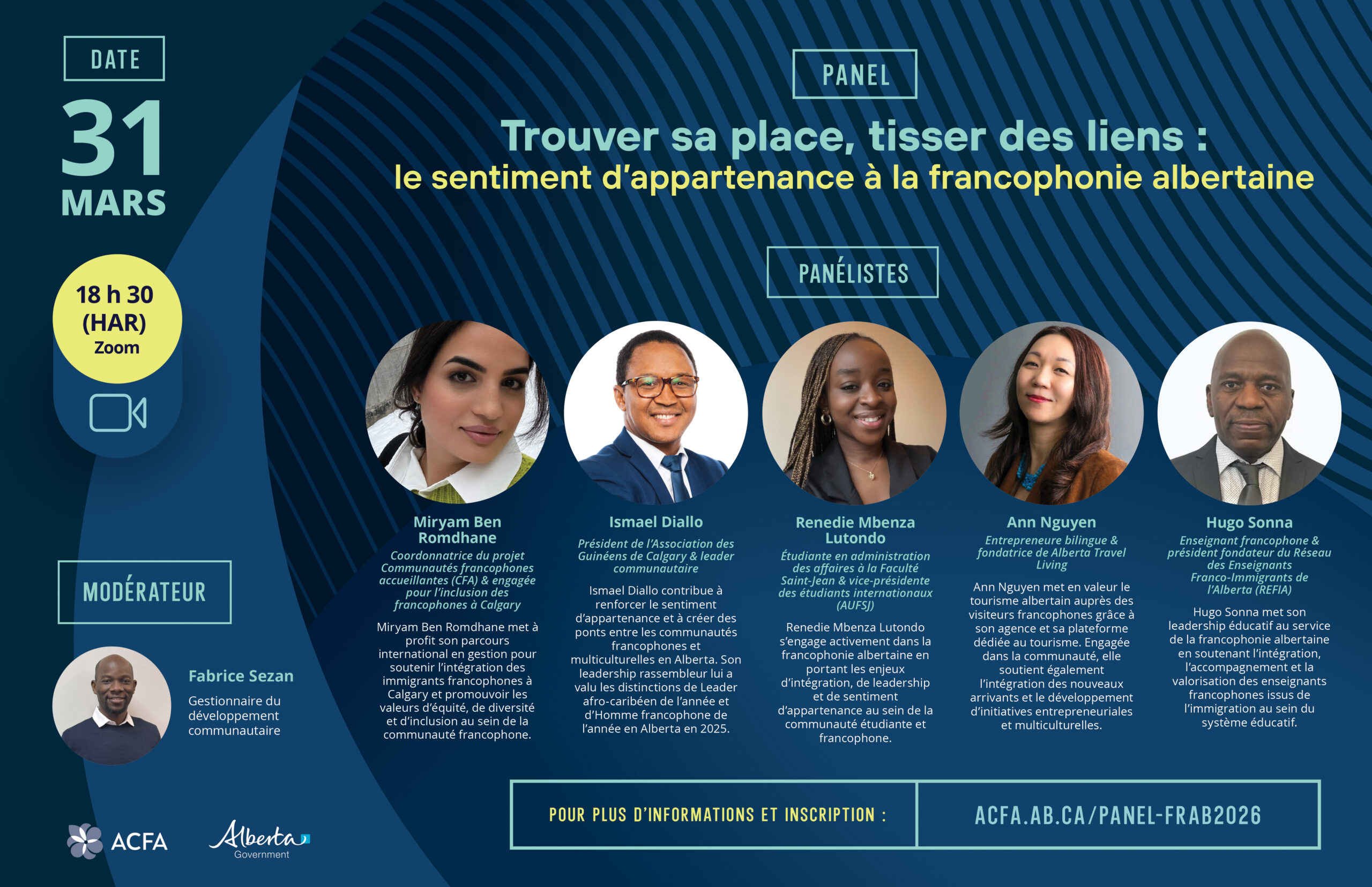 À l’occasion du Mois de la francophonie albertaine, qui se tient du 1er au 31 mars 2026, et avec l’appui du gouvernement de l’Alberta, l’ACFA a le plaisir de vous inviter à un panel le 31 mars à 18h30 intitulé: