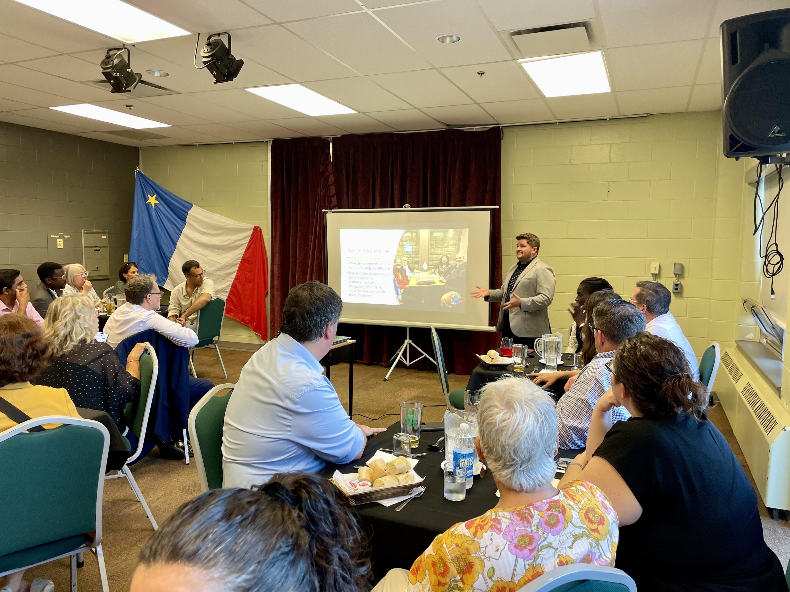 En soirée, une activité communautaire a permis aux directions générales, provenant de partout au pays, de rencontrer la communauté locale lors d’une réception au Carrefour de l’Isle-Saint-Jean, à Charlottetown. Ce moment privilégié a été l’occasion d’échanger avec des membres de la Société acadienne et francophone de l’Île-du-Prince-Édouard (SAF’Île) et de découvrir l’histoire acadienne et francophone de l’île, ainsi que les enjeux locaux portés par cette communauté dynamique. La soirée s’est clôturée par un délicieux souper et un spectacle musical de Philippe et Emmanuelle LeBlanc, un duo père-fille qui a offert un bel aperçu de la richesse culturelle de la francophonie insulaire.