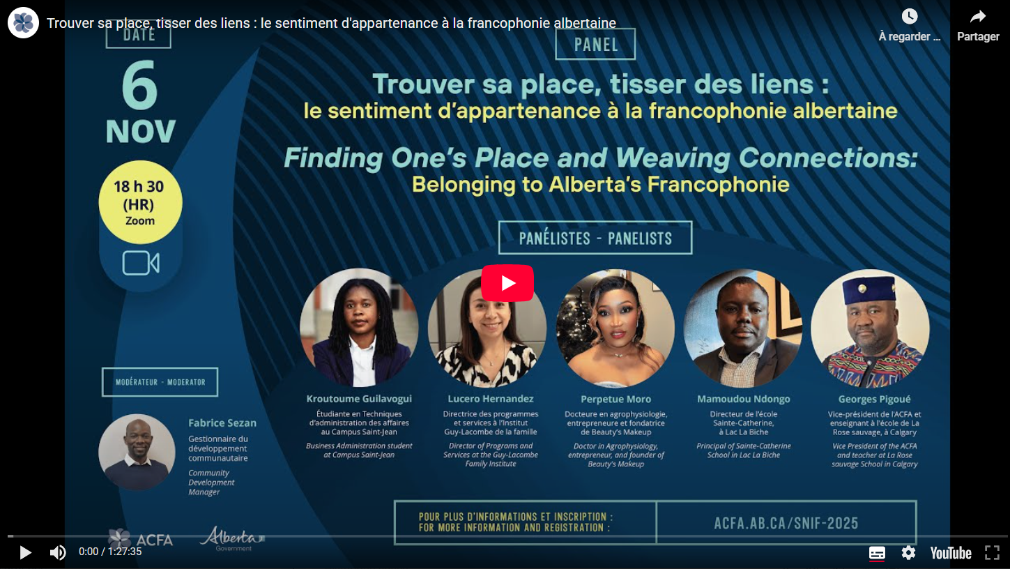 À l’occasion de la Semaine nationale de l’immigration francophone, qui s’est tenue du 2 au 8 novembre 2025, et avec l’appui du gouvernement de l’Alberta, l’ACFA a eu le plaisir de présenter un panel virtuel intitulé :